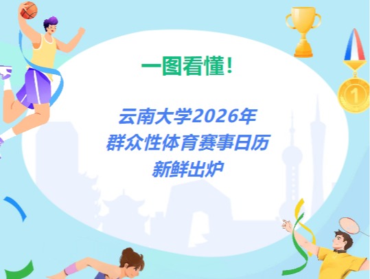 一图看懂!云南大学2026年群众性体育赛事日历新鲜出炉为贯彻落实教育部等五部门《关于实施学生体质强健计划的意见》,大力践行“健康第一”教育理念,落实学校 “课堂·田野·操场 ”育人举措,丰富校园体育文化生活,打造云大特色群众性校园体育品牌,云南大学体育运动委员会结合年度工作安排,现发布2026年度群众性体育赛事计划,诚邀广大师生踊跃参与,在运动中绽放活力、共享健康。