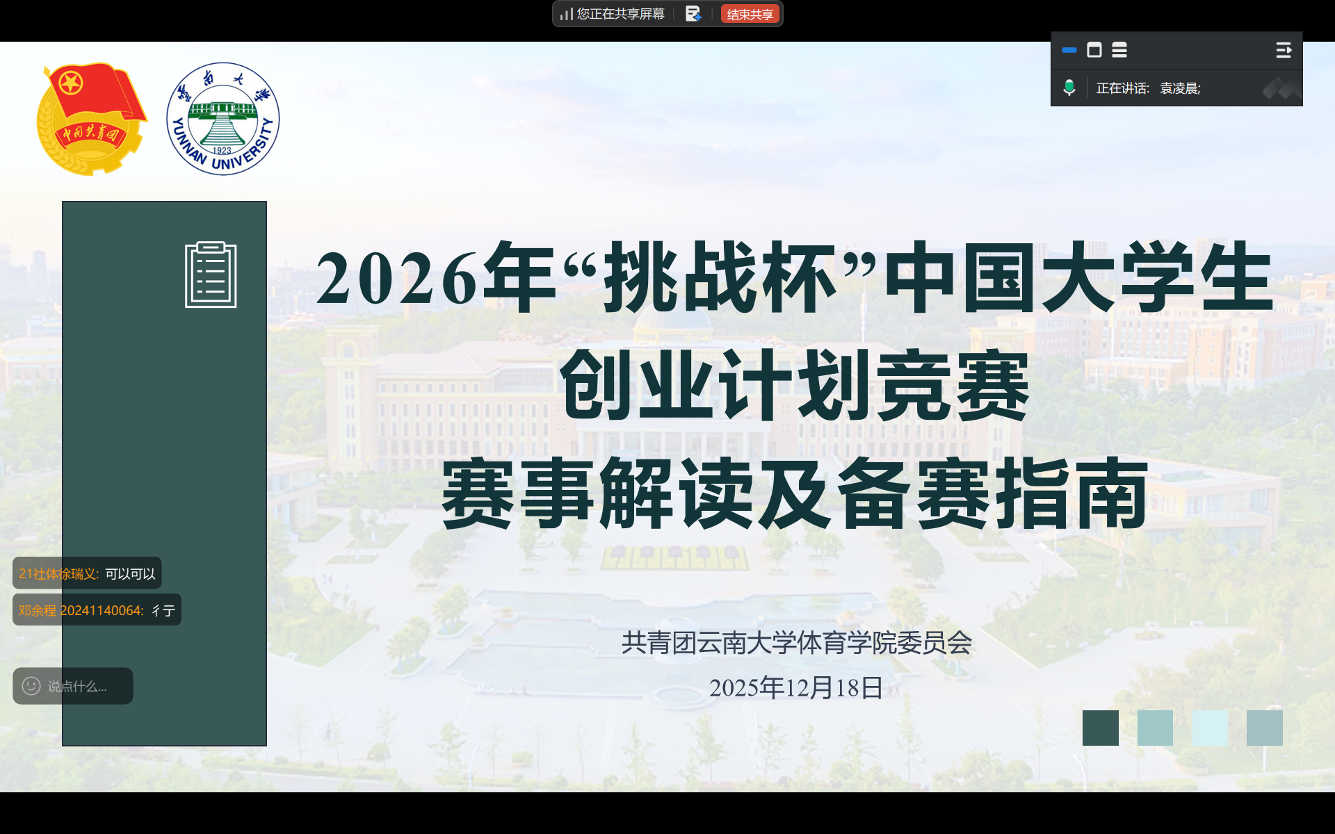 为充分激发学生创新创业热情,扎实做好2026年“挑战杯”中国大学生创业计划竞赛的组织与培育工作,体育学院团委于近日分别面向全院学生和骨干代表,以线上与线下相结合的形式,成功举办了专题宣讲会。会议由学院团委负责人袁凌晨老师主持。