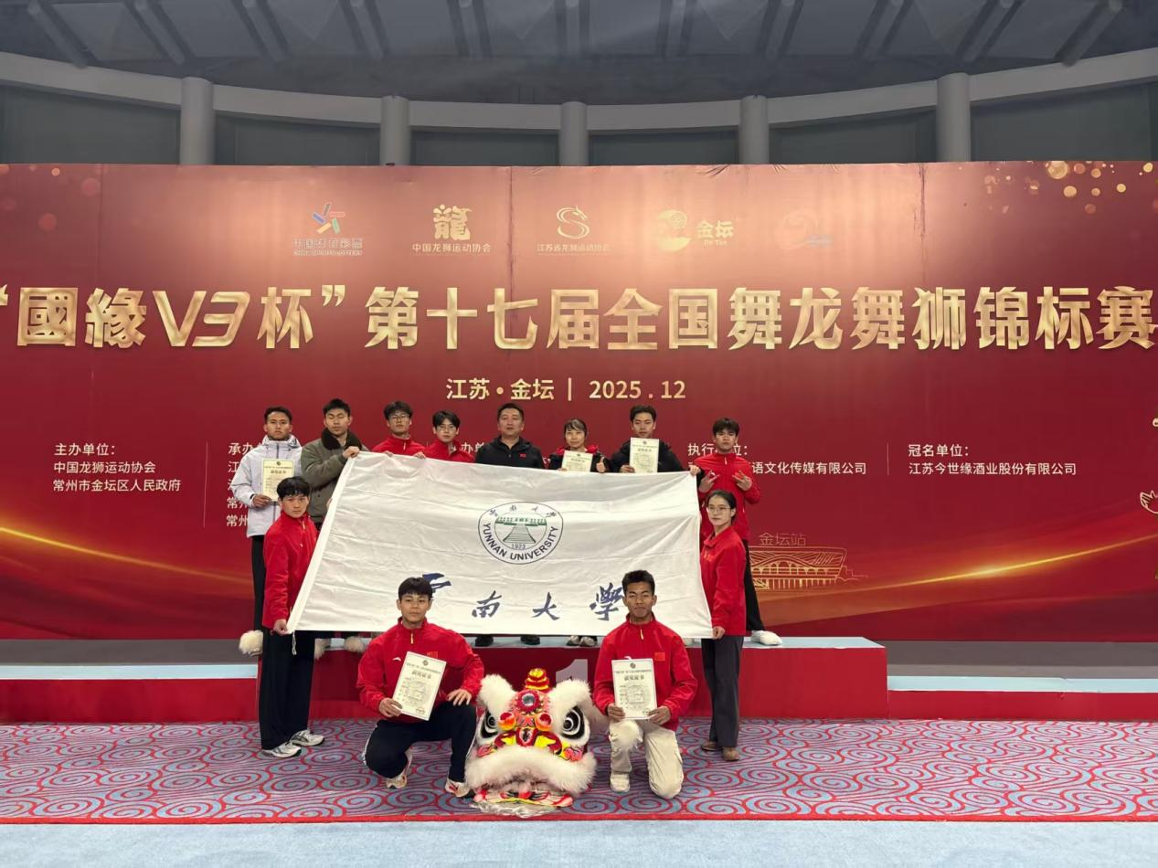 2025年12月5日至10日,第十七届全国舞龙舞狮锦标赛在江苏金坛成功举办。作为国内规格最高、覆盖最广、竞技水平最强的国家级龙狮赛事,本次比赛吸引了来自全国22个省(自治区、直辖市)及粤港澳联队的94支代表队、近1400名运动员参与。云南大学舞龙舞狮队全力以赴、顽强拼搏,最终在南狮传统男子组项目中斩获第六名。