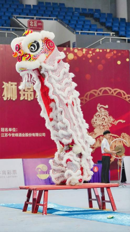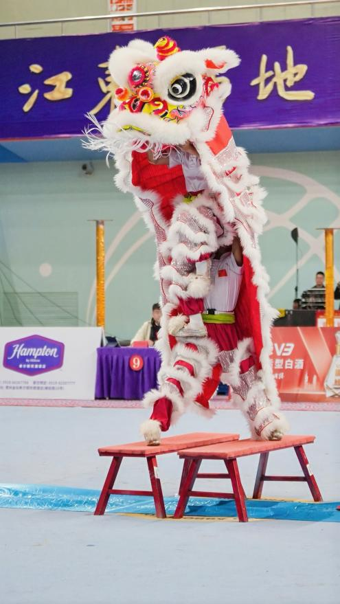 比赛现场,龙狮翻腾、鼓乐铿锵,氛围热烈而紧张。在南狮规定项目中,队员们精神抖擞、配合默契,将南狮的刚柔并济、灵动活泼展现得淋漓尽致,生动呈现了“溪狮戏蟹·趣劫归 ”这一自编主题,精准把控每一个动作细节,腾、跃、扑、闪间尽显南狮灵动神韵。在舞龙规定项目中,每一次腾跃都凝聚着日夜训练的汗水,每一组动作衔接都彰显着团队的凝聚力。