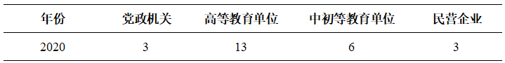 本学位点以签订毕业生就业工作责任书的方式,加强毕业生就业工作的管理与指导。设立毕业生就业专项经费,举办毕业生就业讲座,开展各种资格证书培训以增强毕业生进入社会的就业竞争力。学生就业情况良好,就业率保持在93%。2020年毕业生就业去向:高等教育单位13人,中初等教育单位6人,行政机关单位3人,民营企业3人。